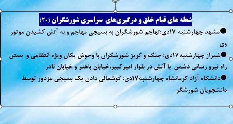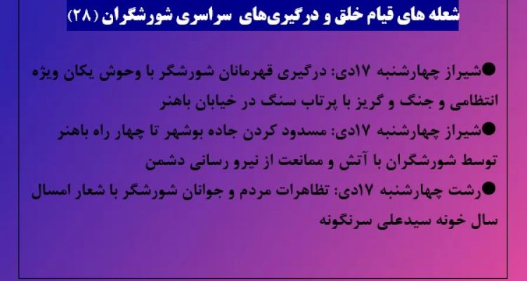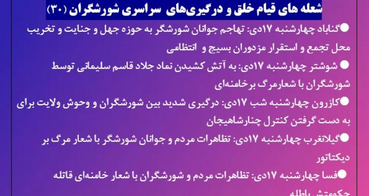 اعتصاب گسترده بازاریان در تهران و ۱۵شهر، تسخیر مرکز سپاه در سرابله و به آتش کشیدن اماکن سپاه در لومار - قیام سراسری - شماره ۳۰