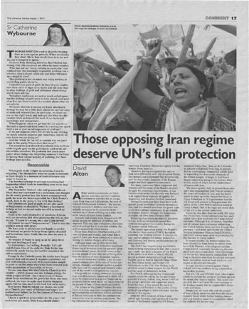 اگر چه جامعة بین المللی نیاز به مقابله موثرتر با تهدیدات اتمی ایران را به رسمیت شناخته, با اینحال نتوانسته از خواسته های دمکراتیک مردم ایران و جنبش آپوزیسیون آن حمایت کند. من سالیان است که از مبارزة مردم ایران برای دمکراسی و آزادی حمایت کرده و در صف مقدم آن بوده ام. برای من مشخص شده تنها راه رو به جلو حمایت از ایرانیانی است که برای دمکراسی و آزادی در سرزمین خود مبارزه میکنند. طی سال گذشته یک جنبش گسترده ”انقلاب سبز” در سراسر ایران در جریان بوده و این باید به منزلة چراغ سبزی به جامعه بین المللی برای حمایت از مبارزه مردم ایران برای دمکراسی تلقی میشد.