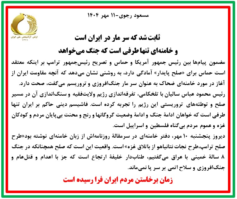 دیروز پنجشنبه ۱۰ مهر، دفتر خامنهای در سرمقاله روزنامهاش از زبان خامنهای نوشته بود«طرح صلح ترامپ،طرح نجات نتانیاهو از باتلاق غزه» است. واقعیت این است که صلح همچنانکه در جنگ ۸ ساله خمینی با عراق میگفتیم، طنابدار خلیفه ارتجاع است که جز با اعدام و قتلعام و جنگافروزی و سلاح اتمی بر سر پا نمیماند.