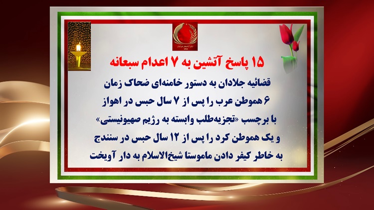 قضائیه جلادان به دستور خامنه‌ای ضحاک زمان  ۶ هموطن عرب را پس از ۷ سال حبس در اهواز  با برچسب «تجزیه‌طلب وابسته به رژیم صهیونیستی» و یک هموطن کرد را پس از ۱۲ سال حبس در سنندج به خاطر کیفر دادن ماموستا شیخ‌الاسلام به دار آویخت.