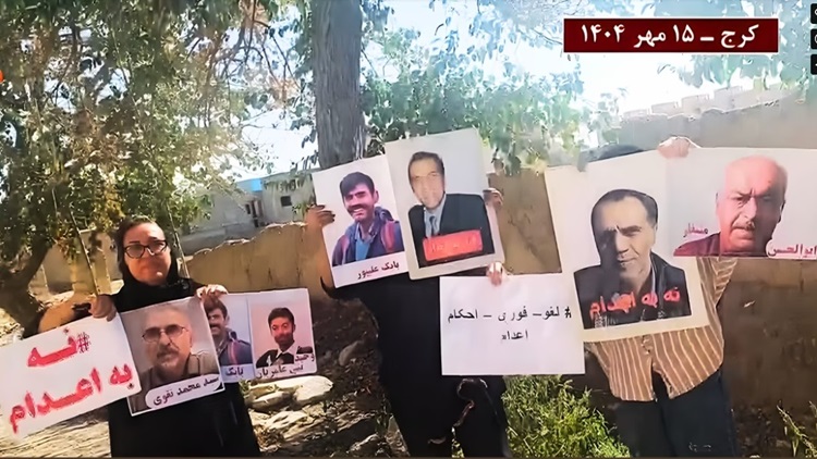 در کرج خانواده شاهرخ دانشور کار در یک آکت اعتراضی، با در دست داشتن تصاویر زندانیان سیاسی و پلاکاردهایی با شعارهای «نه به اعدام»، «نه به احکام قرون وسطایی» و «فرزندان ما را اعدام نکنید» خواستار لغو فوری حکم اعدام شدند.