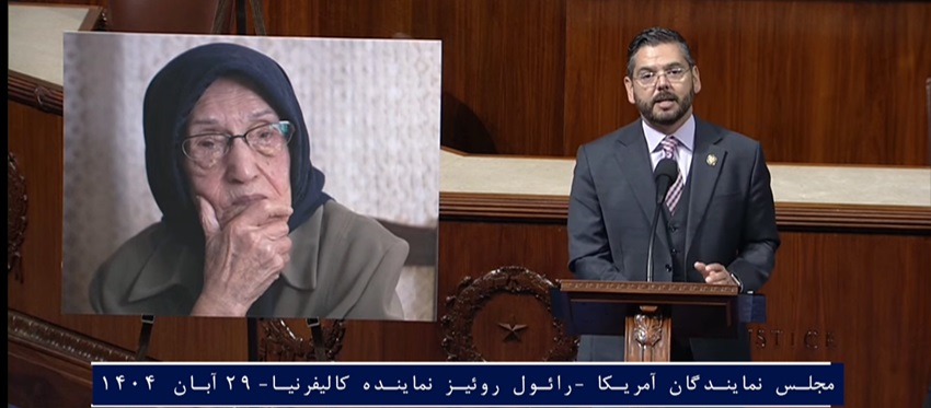 نماینده کنگره رائول روئیز (Raul Ruiz): رئیس، امروز بهپا خاستهام تا شجاعت و فداکاری عمیق زنی را گرامی بدارم که داستانش نماد مبارزه پایدار برای آزادی و کرامت انسانی در ایران است. زنی که بهسادگی و با محبت «عزیز» نامیده میشود، بهمعنای «عزیز» یا «محبوب». نام کامل او عزیز رضایی است و او مادر مقاومت است.