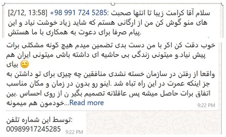 • سلام آقای کرامت زیبا ، تا انتها صحبت های من گوش کن من ازارگانی هستم که شاید زیاد خوشت نیاد واین پیام صرفا برای دعوت به همکاری با ما هستش. خوب دقت کن اگر با من دست بدی تضیمن میدهم هیچ گونه مشکلی برایت پیش نیاد ومیتونی زندگی بی حاشیه ای داشته باشی ، میتوانی ایران هم بیای. واقعا از رفتن درسازمان خسته نشدی منفقین چه چیزی برای تو داشتن به جز اینکه عمرت دراین راه تباه شد. اینورو بدون در زمان مکان مناسب اتفاق برات حاصل میشه پس عاقلانه تصمیم بگیرن ، از روی احساس . بین خودمون میمونه.