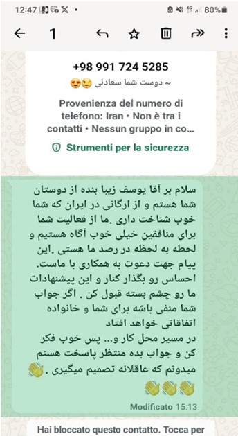 • سلام بر آقا یوسف زیبا بنده از دوستان شما هستم و از ارگانی در ایران که شما خوب شناخت داری .ما از فعالیت شما برای منافقین خیلی خوب آگاه هستیم و لحطه به لحظه در رصد ما هستی .این پیام جهت دعوت به همکاری‌ با ماست. احساس رو بگذار کنار و این پیشنهادات ما رو چشم بسته قبول کن . اگر جواب شما منفی باشه برای شما و خانواده اتفاقاتی خواهد افتاد در مسیر محل کار و... پس خوب فکر کن و جواب بده منتظر پاسخت هستم میدونم که عاقلانه تصمیم میگیری