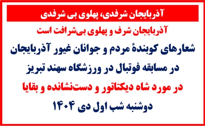 آذربایجان شرفدی پهلوی بیشرفدی آذربایجان شرفدی، پهلوی بی شرفدی-آذربایجان شرف و پهلوی بیشرافت است شعارهای کوبندة مردم و جوانان غیور آذربایجان در مسابقه فوتبال در ورزشگاه سهند تبریز در مورد شاه دیکتاتور و دستنشانده و بقایا - دوشنبه شب اول دی ۱۴۰۴