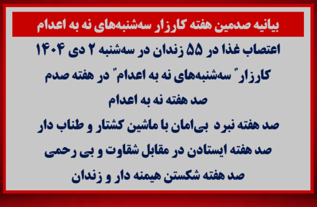 کارزار" سهشنبههای نه به اعدام" در هفته صدم سهشنبه ۲ دی ۱۴۰۴ در ۵۵ زندان زیر در اعتصاب غذا میباشند: