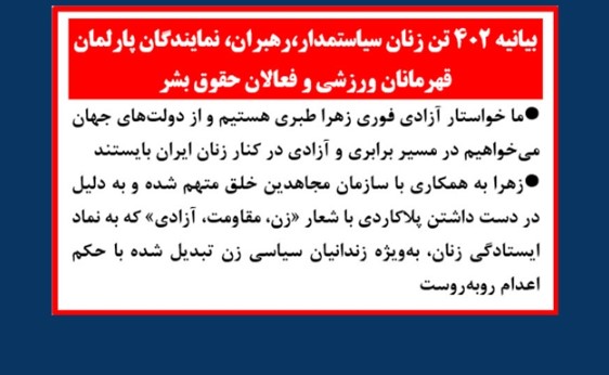 •بیانیه ۴۰۲ تن زنان سیاستمدار،رهبران، نمایندگان پارلمان ، قهرمانان ورزشی و فعالان حقوق بشر