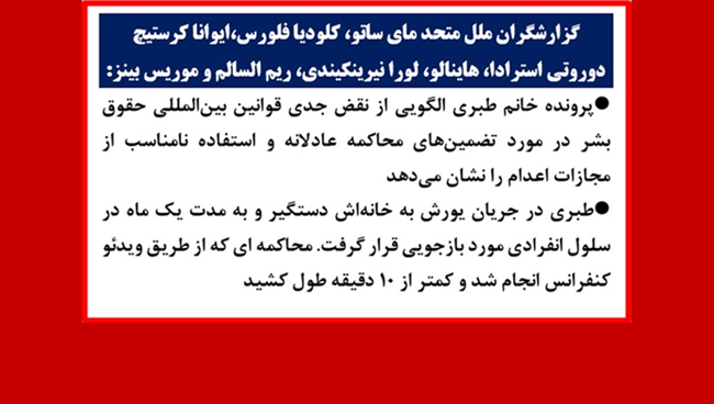 - این ۸ گزارشگر در بیانیهیی که توسط کمیساریای عالی حقوقبشر منتشر شده است اعلام کردند پرونده خانم طبری الگویی از نقض جدی قوانین بینالمللی حقوقبشر در مورد تضمینهای محاکمه عادلانه و استفاده نامناسب از مجازات اعدام را نشان میدهد.