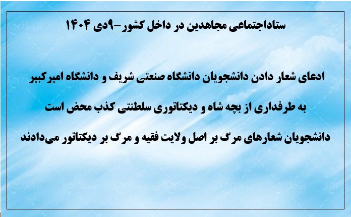 ستاداجتماعی مجاهدین در داخل کشور-۹دی ۱۴۰۴ ادعای شعار دادن دانشجویان دانشگاه صنعتی شریف و دانشگاه امیرکبیر به طرفداری از بچه شاه و دیکتاتوری سلطنتی کذب محض است دانشجویان شعارهای مرگ بر اصل ولایت فقیه و مرگ بر دیکتاتور میدادند