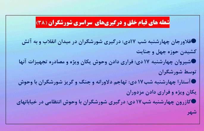 - کازرون چهارشنبه شب۱۷ دی: درگیری شورشگران با وحوش انتظامی در خیابانهای شهر