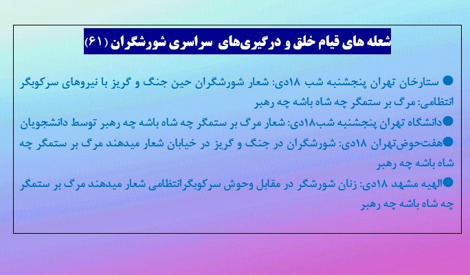 ستارخان تهران پنجشنبه شب ۱۸دی: شعار شورشگران حین جنگ و گریز با نیروهای سرکوبگر انتظامی: مرگ بر ستمگر چه شاه باشه چه رهبر