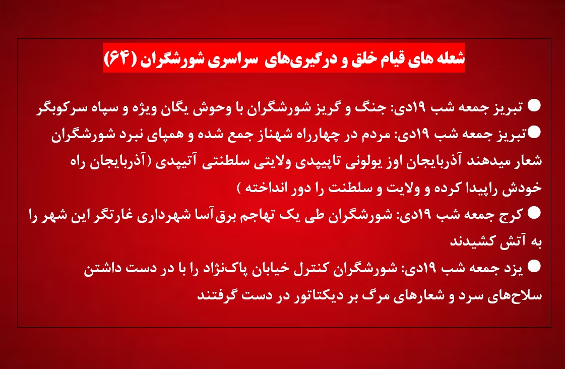تبریز جمعه شب ۱۹دی: مردم در چهارراه شهناز جمع شده و همپای نبرد شورشگران شعار میدهند آذربایجان اوز یولونی تاپیپدی ولایتی سلطنتی آتیپدی (آذربایجان راه خودش راپیدا کرده و ولایت وسلطنت را دور انداخته )