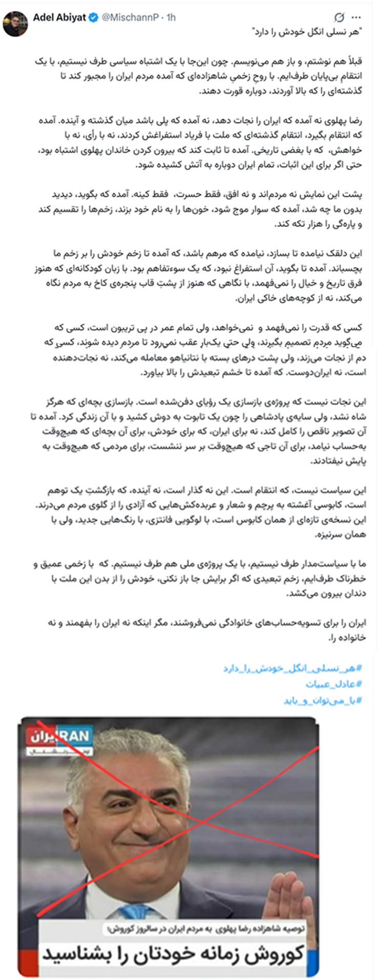 کسی که قدرت را نمیفهمد و نمیخواهد، ولی تمام عمر در پی تریبون است، کسی که میگوید مردم تصمیم بگیرند، ولی حتی یکبار عقب نمیرود تا مردم دیده شوند، کسی که دم از نجات میزند، ولی پشت درهای بسته با نتانیاهو معامله میکند، نه نجاتدهنده است، نه ایراندوست. که آمده تا خشم تبعیدش را بالا بیاورد.
