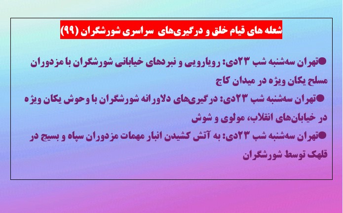 تهران سهشنبه شب ۲۳دی: به آتش کشیدن انبار مهمات مزدوران سپاه و بسیج در قلهک توسط شورشگران