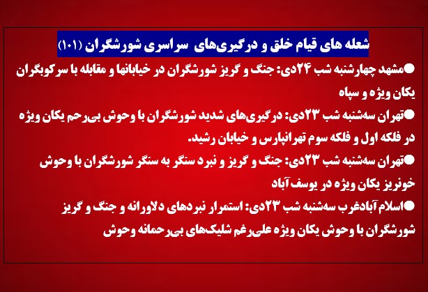 • تهران سه‌شنبه شب ۲۳دی: جنگ و گریز و نبرد سنگر به سنگر شورشگران با وحوش خونریز یکان ویژه در یوسف‌آباد