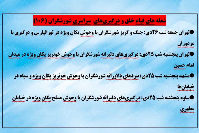 - تهران پنجشنبه شب ۲۵دی: درگیریهای دلیرانه شورشگران با وحوش خونریز یکان ویژه در میدان امام حسین