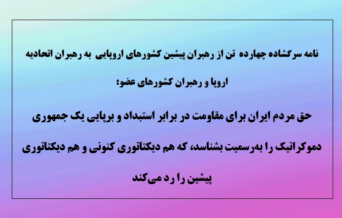 - نامه سرگشاده چهارده تن از رهبران پیشین کشورهای اروپایی به رهبران اتحادیه اروپا و رهبران کشورهای عضو: حق مردم ایران برای مقاومت در برابر استبداد و برپایی یک جمهوری دموکراتیک را بهرسمیت بشناسد، که هم دیکتاتوری کنونی و هم دیکتاتوری پیشین را رد میکند