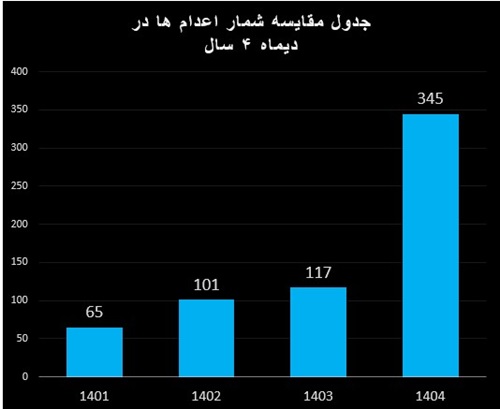 خامنهای همپای با سرکوب وحشیانه و کشتار جوانان در جریان قیام در سراسر کشور، در دی ماه دست کم ۳۴۵ زندانی را در۵۷ شهر از ۳۱ استان، به چوبه های دار سپرده است. استان خراسان رضوی با ۴۲ اعدام، خوزستان با ۲۹ اعدام، اصفهان با ۲۳ اعدام، لرستان با ۲۱ اعدام، فارس با ۱۷ اعدام و کرمان با ۱۶ اعدام در صدر لیست کشتار قضائیه جلادان قرار داشتند. شمار اعدامها در این ماه حدود ۳ برابر دی سال ۱۴۰۳ با ۱۱۷ اعدام و حدود ۵/۳ برابر دی ۱۴۰۲ با ۱۰۱ اعدام و حدود ۵ برابر ۱۴۰۱ با ۶۵ اعدام میباشد.