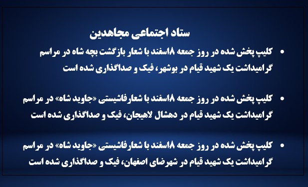 - کلیپ پخش شده در روز جمعه ۸اسفند با شعارفاشیستی «جاوید شاه» در مراسم گرامیداشت یک شهید قیام در شهرضای اصفهان، فیک و صداگذاری شده است