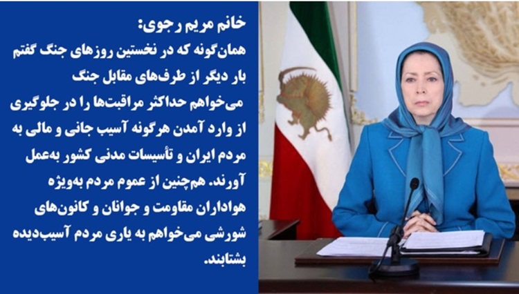 همانگونه که در نخستین روزهای جنگ گفتم بار دیگر از طرفهای مقابل جنگ میخواهم حداکثر مراقبتها را در جلوگیری از وارد آمدن هرگونه آسیب جانی و مالی به مردم ایران و تأسیسات مدنی کشور بهعمل آورند. همچنین از عموم مردم بهویژه هواداران مقاومت و جوانان و کانونهای شورشی میخواهم به یاری مردم آسیبدیده بشتابند.