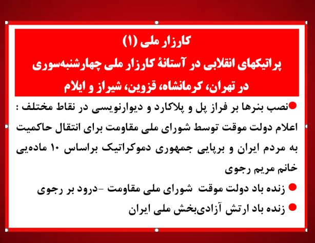 • تهران-نصب بنرها در نقاط مختلف : اعلام دولت موقت توسط شورای ملی مقاومت برای انتقال حاکمیت به مردم ایران برپایی جمهوری دموکراتیک براساس ۱۰ مادهیی خانم مریم رجوی