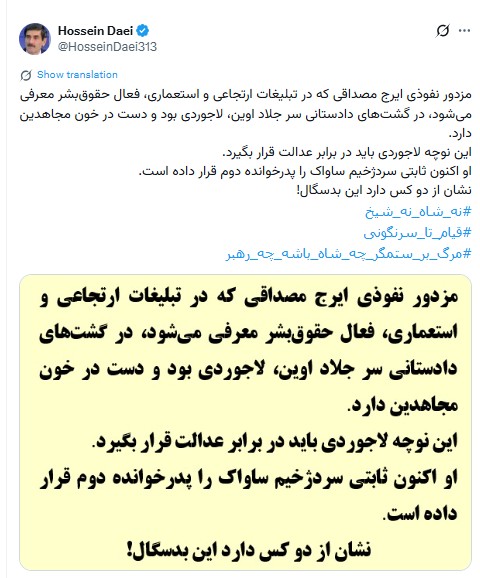 حسین داعی: مزدور نفوذی ایرج مصداقی که در تبلیغات ارتجاعی و استعماری، فعال حقوقبشر معرفی میشود، در گشتهای دادستانی سر جلاد اوین، لاجوردی بود و دست در خون مجاهدین دارد. این نوچه لاجوردی باید در برابر عدالت قرار بگیرد. او اکنون ثابتی سردژخیم ساواک را پدرخوانده دوم قرار داده است. نشان از دو کس دارد این بدسگال!