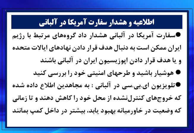 تلویزیون ای.بی.سی در آلبانی : به اعضای کمپ مجاهدین اطلاع داده شده که خروجهای کنترلنشده از محل خود را کاهش دهند و تا زمانی که وضعیت در خاورمیانه بهبود یابد، بیشتر در داخل کمپ بمانند.