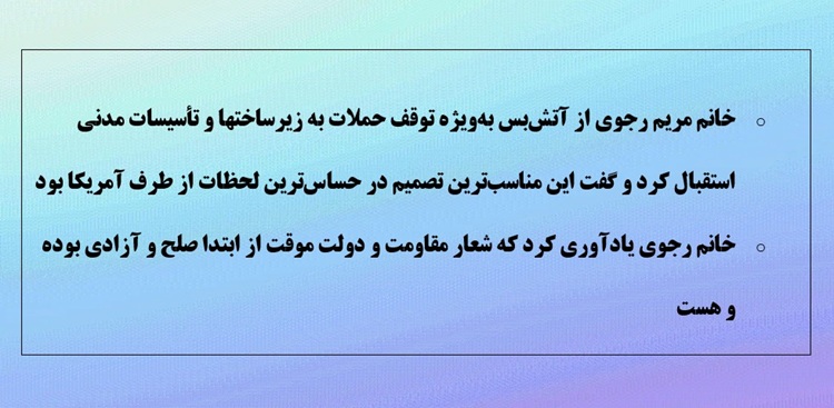 • خانم مریم رجوی از آتش‌بس به‌ویژه توقف حملات به زیرساختها و تأسیسات مدنی استقبال کرد و گفت این مناسب‌ترین تصمیم در حساس‌ترین لحظات از طرف آمریکا بود.