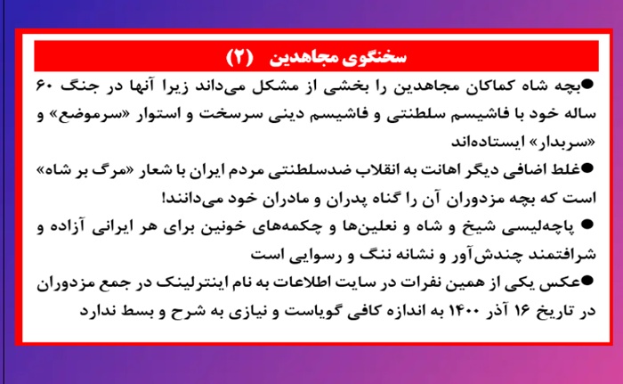 - منظور بچة شاه مزدوران افشا شدة اطلاعات آخوندها تحت عنوان «اعضاء سابق مجاهدین» است که عمداً برای کسب اعتبار از نام مجاهدین آنها را چنین رنگآمیزی میکند