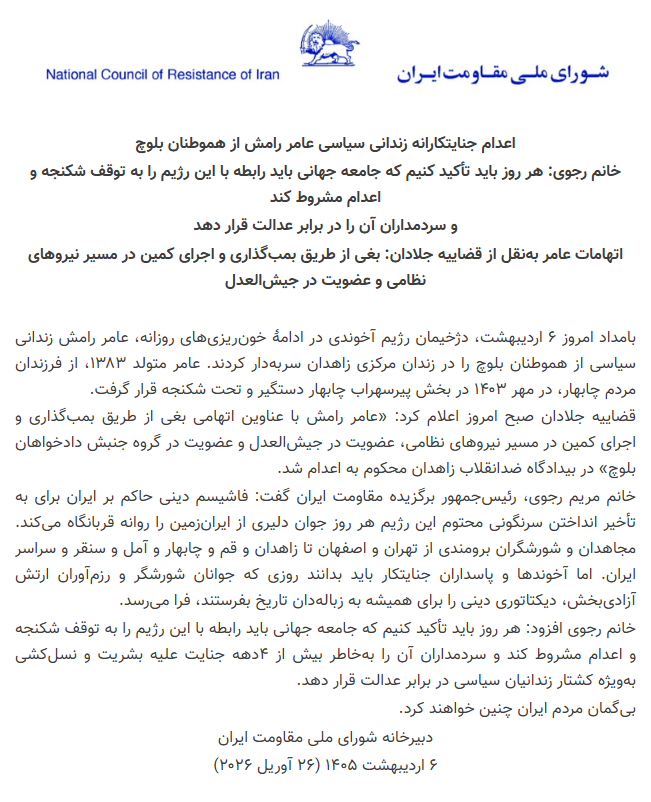 اعدام جنایتکارانه زندانی سیاسی عامر رامش از هموطنان بلوچ