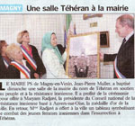 روزنامه پا ریزین (29دی88) خبر شرکت خانم مریم رجوی ، رئیس جمهور برگزیده مقاومت، در مراسم افتتاح سالن تهران در شهرداری مانی را منعکس کرد. پاریزین نوشت: روز یکشنبه شهردار سوسیالیست مانی آن وکسن، ژان پیر مولر، در حمایت از مردم و مقاومت ایران، یکی از سالن های شهرداری مانی آن وکسن را به نام تهران نامگذاری کرد. به مناسبت این مراسم،او مدال طلای شهر را به مریم رجوی اهدا کرد که رئیس جمهور (برگزیده) شورای ملی مقاومت ایران مستقر در اورسور اواز میباشد.
