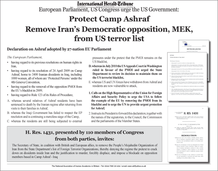 1- پارلمان اروپا به نماینده عالی اتحادیه اروپا در سیاست خارجی و امنیتی فراخوان میدهد تا از دولت ایالات متحده بخواهد همانند اتحادیه اروپا سازمان مجاهدین خلق ایران را از لیست خود خارج کند و هم چنین از سازمان ملل متحد نیز بخواهد که حفاظت فوری برای ساکنان اشرف را تامین کند.