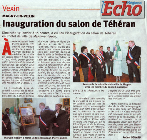 یکشنبه 27 دی 88 سالن ”تهران” در شهرداری مانی افتتاح شد. به این مناسبت ژان پیر مولر شهردار مانی که به ارزش آزادی بسیار وابسته است، مدال شهر مانی را که به نام مریم رجوی حک شده بود به وی اهداء کرد.