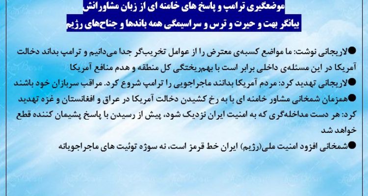 موضعگیری ترامپ و پاسخ های خامنه ای از زبان مشاورانش بیانگر بهت و حیرت و ترس و سراسیمگی همه باندها و جناحهای رژیم