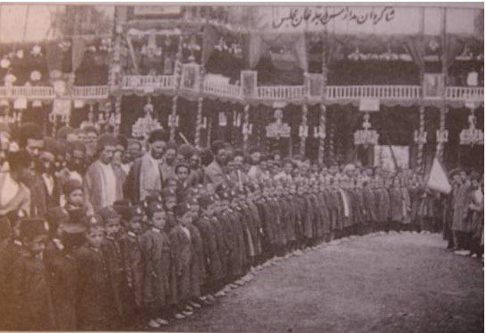 (صف شاگردان مدارس جدید تهران پس از پیروزی انقلاب مشروطه در جلو مجلس شورای ملی ایران)