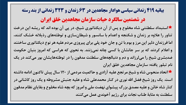 بیانیه ۴۱۹ زندانی سیاسی هوادار مجاهدین در ۶۳ زندان