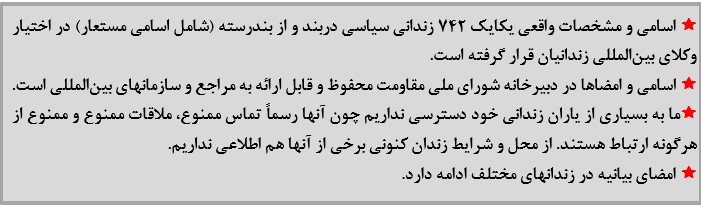 ما زندانیان سیاسی هوادار سازمان مجاهدین چه آنها که بیش از دو دهه است در زندان بسر می بریم، چه آنها که در ماهها و سالهای اخیر دستگیر شده ایم و چه آنها که محکوم به اعدام هستیم و در انتظار پیوستن به بهروز احسانی و مهدی حسنی، در سالروز فرخنده تأسیس سازمان مجاهدین که با ایام میلاد پیامبر رحمت و رهایی مقرون شده است، بار دیگر با خدا و خلق و سازمان مجاهدین پیمان میبندیم که سرموضع و رزمنده تا آخرین نفس و تا آخرین قطره خون در راه آزادی میهن اسیر قدمی به عقب نگذاریم، باشد که شایسته باشیم که در این راه به کاروان جاوادانه فروغها و مجاهدان سربدار سرموضع بپیوندیم.