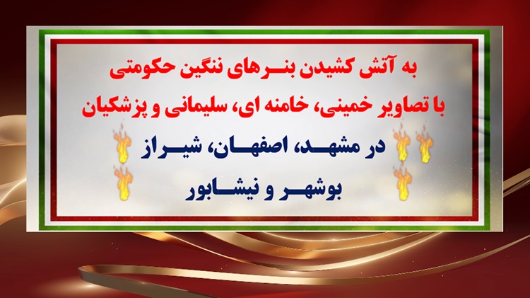 • به آتش کشیدن پوستر و بنـرهای حکومتی با تصاویر خمینی، خامنه ای، سلیمانی و پزشکیان در مشهد، اصفهان، شیراز ، بوشهر و نیشابور