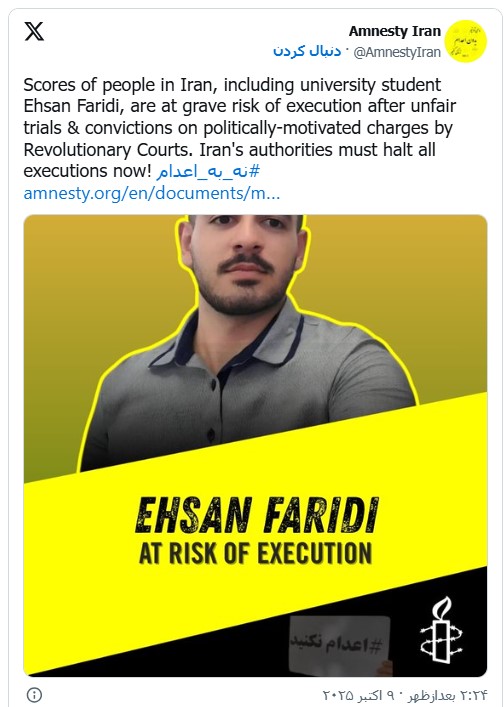 عفو بینالملل روز ۱۶مهر اعلام کرد: دهها تن در ایران از جمله احسان فریدی دانشجوی دانشگاه، پس از محاکمههای ناعادلانه و محکومیتهای مبتنی بر اتهامات سیاسی، در معرض خطر اعدام هستند، مقامات ایران باید فوراً تمام اعدامها را متوقف کنند.