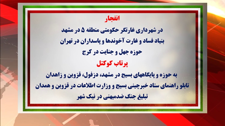 •پرتاب کوکتل به ۲ حوزه بسیج سپاه پاسداران در مشهد