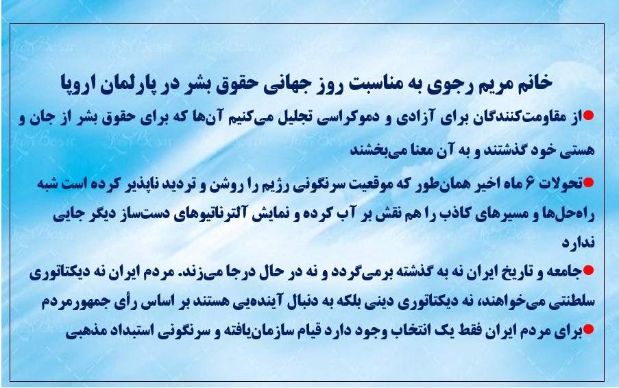 امروز من به خانه دموکراسی مردم اروپا آمدهام تا از منتخبان ملتهای اروپا و از همه مردم و دولتهای جهان بخواهم که مبارزه مردم ایران برای سرنگونی استبداد دینی را بهرسمیت بشناسند.