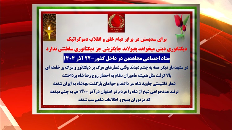 •ستاد اجتماعی مجاهدین در داخل کشور ۲۲ آذر ۱۴۰۴ : در مشهد بار دیگر همه به چشم دیدند وقتی شعارهای مرگ بر دیکتاتور و مرگ بر خامنه ای بالا گرفت مثل همیشه مأموران نظام به احضار روح رضا شاه پرداختند شعار فاشیستی جاوید شاه سر دادند و خواهان بازگشت بچهشاه به ایران شدند