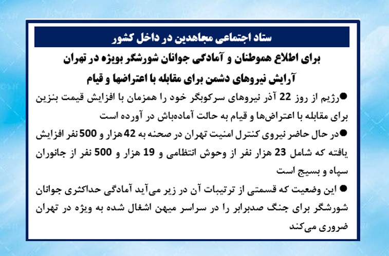 رژیم از روز ۲۲ آذر نیروهای سرکوبگر خود را همزمان با افزایش قیمت بنزین برای مقابله با اعتراضها و قیام به حالت آمادهباش در آورده است. این وضعیت که قسمتی از ترتیبات آن در زیر میآید آمادگی حداکثری جوانان شورشگر برای جنگ صدبرابر را در سراسر میهن اشغال شده به ویژه در تهران ضروری میکند.
