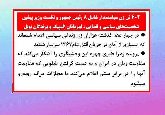 •بیانیه ۴۰۲ تن زنان سیاستمدار،رهبران، نمایندگان پارلمان ، قهرمانان ورزشی و فعالان حقوق بشر از ۷۰ کشور