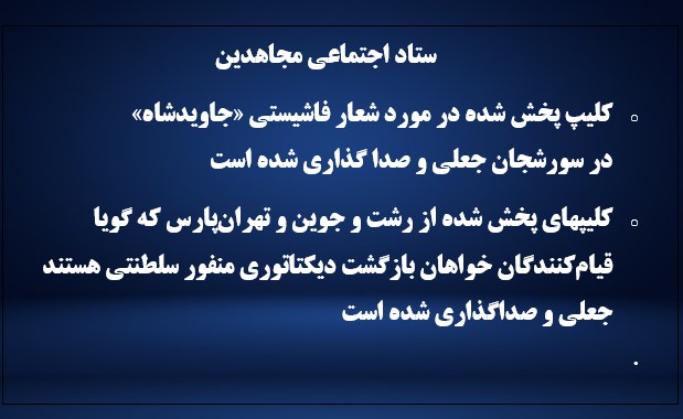 - کلیپهای پخش شده از رشت و جوین و تهرانپارس که گویا قیامکنندگان خواهان بازگشت دیکتاتوری منفور سلطنتی هستند جعلی و صداگذاری شده است