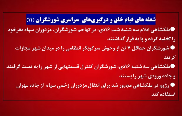 ملکشاهی ایلام سه شنبه شب ۱۶دی: در تهاجم شورشگران، مزدوران سپاه مقرخود را تخلیه کرده و پا به فرار گذاشتند.