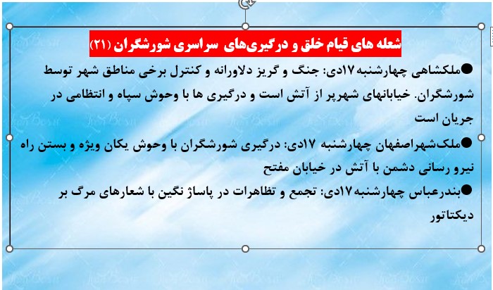 ملکشاهی چهارشنبه۱۷دی: جنگ و گریز دلاورانه و کنترل برخی مناطق شهر توسط شورشگران. خیابانهای شهرپر از آتش است و درگیری ها با وحوش سپاه و انتظامی در جریان است