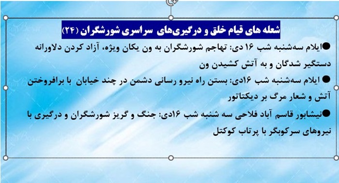 نیشابور قاسم آباد فلاحی سه شنبه شب ۱۶دی: جنگ و گریز شورشگران و درگیری با نیروهای سرکوبگر با پرتاب کوکتل