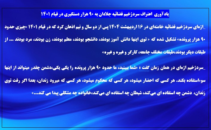 شایان یادآوری است که اژه‌ای سردژخیم قضائیه خامنه‌ای در ۱۶ اردیبهشت ۱۴۰۴ پس از دو سال و نیم اذعان کرد که در قیام ۱۴۰۱ «چیزی حدود ۹۰ هزار پرونده» تشکیل شده که « توی اینها دانش آموز بودند، دانشجو بودند، معلم بودند، زن بودند، مرد بودند ... از طبقات دیگر بودند،طبقات مختلف جامعه، کارگر و غیره و غیره»