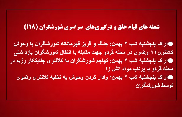 - اراک پنجشنبه شب ۲ بهمن: جنگ و گریز قهرمانانه شورشگران با وحوش کلانتری۱۲-رضوی در محله گردو جهت مقابله با انتقال شورشگران بازداشتی